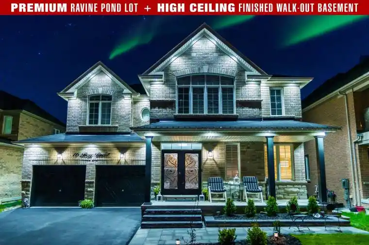 Step into a masterpiece where luxury meets tranquility in Tottenham’s most coveted enclave! This extraordinary home, the largest builder model, rests on a premium ravine lot with breathtaking water views and backyard sunsets, offering almost 5,000 sqft of resort-style living space. Nature’s serenity is your backdrop here, enhanced by an additional 1,000+ sqft of meticulously designed outdoor living areas, including a sprawling covered deck directly off the kitchen. Every corner of this home is a testament to unparalleled craftsmanship and well over $500K in bespoke upgrades! Imagine mornings bathed in natural light from panoramic windows in your grand family room with a coffered ceiling. Relish culinary adventures in the chef’s dream kitchen featuring top-tier appliances, oversized quartz countertops, a walk-through servery, and an outdoor-ready second kitchen for al fresco gatherings. The main floor is no less than an entertainers paradise, with a custom wooden den/bar/cigar room, elegant wainscoting, built-in dry bar, and seamless flow into spacious, open concept living areas. Retreat upstairs to a palatial primary suite with soaring ceilings, a spa-like ensuite, and a rainfall shower that feels like a personal oasis. All secondary bedrooms boast premium finishes and glass-enclosed showers for a luxe touch. But that’s only the beginning. Descend to the brand-new walk-out basement, a nature-facing haven with rare builder-upgraded high ceilings, massive above-grade windows, and double French-door offices or bedrooms. Ethernet pre-wiring and ultra-premium gold-accented finishes elevate this space, creating a versatile retreat for work or play. Practicality meets elegance with quartz counters throughout (even in the laundry!), custom closet organizers, ample driveway parking for up to 6 cars, and no sidewalk or road parking interruptions. Just a stroll from shops, restaurants, and everyday essentials. This is not just a home, it’s a lifestyle that eagerly awaits!