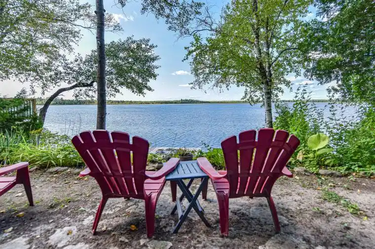 Cottage waterfront property.. Each well appointed cottage is clean and nicely decorated. They are completely self contained, each having a septic tank. There is a work shop with power . The furniture is practical and pleasant First terrace has outdoor cooking equipment and seating area Next is for viewing the water and enjoying the tree canopy.(no lawn to cut due to shade and rock) Lowest level is for swimming, and getting into the boats.A less sloping access at far right. Children can fish off the dock for hours of fun. Easy trip to Orillia, Brechin and Beaverton for supplies, hardware, etc.Brechin also has the Township office in the event you want Property information or details about short term rentals. There is a recreation hall on Lake Dalrymple Road (take the boat) which also offers a library. There are kids programs there and at the Dalton Hall near Sebright. Sebright also has a general store and there are farm markets all around.Both of these cottages are well maintained The access roads are not maintained by the Township and residents each pay about $250 for road maintenance. In summer ,trash and recycling are picked up at the door in winter, at the bottom of the hill. There is a residents boat launch further down the lane at the orange gates for ease of putting the boat in first time. This is a great set up for family and extended family or long time friends where you can be together at times and still have privacy. A truly lovely offering and it is priced to sell.The photos are really great, but reality comes with clean crisp air and the sounds of laughter. The lake continues under the bridge at the narrows into a deeper and larger lake. Fishing both winter and summer. Snowmobile club and trails for winter fun and the Carden Plain trails for exploring Nature and birdwatching. If looking to visit year round,the drilled well is located opposite at the access road. easy hook up! Sunsets and fishing are famous.