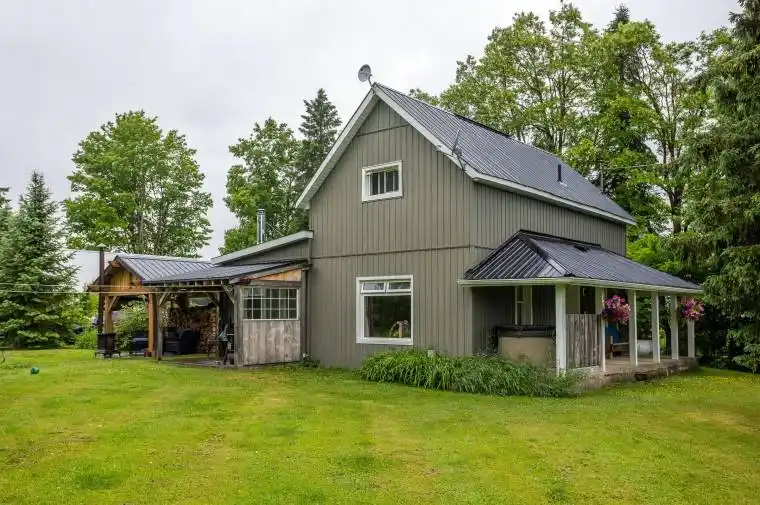 Shop and 1100 square foot home on over an acre just outside Flesherton. Set back off the road with maturing trees along the boundaries, this country package is beautifully renovated and ready for someone new to enjoy. Updated kitchen with island and breakfast bar, quartz countertops and stainless steel appliances. Livingroom with lots of natural light overlooking the yard, a den or sitting room with walkout to patio and mudroom/laundry and powder room complete the main level. There are two spacious bedrooms with closets on the second level with a full bath. The covered front porch with hot tub is just the beginning of the outdoor entertaining areas. Steel roof, propane furnace, drilled well and septic with risers. Custom gazebo with timberframe accents, steel roof and tv hook up. The 30×46 new shop is divided into two areas, featuring a wood-lined 15×30 space with second level storage loft, as well as a 30×30 garage with 10 foot ceilings and roll up doors. Make your move to the country in style!