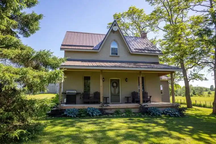 This 50-acre farm offers a beautifully renovated Ontario farmhouse with thoughtful updates throughout. The 4-bedroom, 2-bath home features a custom solid oak kitchen by Hanover Kitchens with a center island, dining area, and a convenient laundry/pantry room just off the kitchen. The main floor includes an office or additional bedroom, 3 piece bath, two spacious living areas and a cozy woodstove. Upstairs you’ll find four more bedrooms, including a generous primary suite, a 5-piece bath, and warm pine floors. Enjoy outdoor living with a large covered front porch, a new back deck with gazebo (2024), and a firepit area. Upgrades include a steel roof, new back windows, siding, soffit, fascia, and eaves (2024). Very solid bank barn with extensive updates,100-amp panel, set up for loose housing for cattle but also has two box stalls for horses and a chicken coop. A huge amazing shop (48’x35′) with 14 foot doors and hot water radiant heater (propane). Additional office space/show room (26.5’x35′), added in 2011, features a 2-piece bath with septic, in-floor radiant heat, waste oil furnace, and 200-amp service, offering excellent personal or commercial potential. Central hydro metering adds further convenience. The farm’s perimeter is fenced with approximately 35 acres cleared/pasture and the balance made up of bush and a creek. Located on a paved road, this property has it all and is turn key.