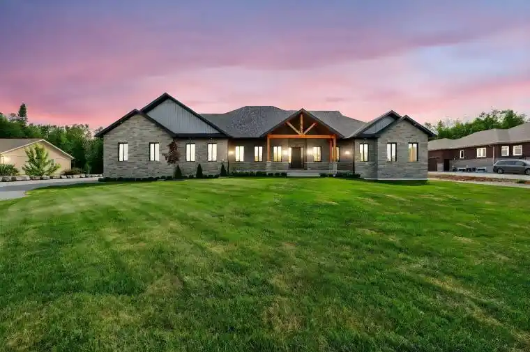 Quality builder, Tarion warranty included! Brand New. Sprawling 3200 sq ft Custom stone and brick bungalow on over an acre. From the large entrance way and office/library Experience high end finishings throughout, from the wide plank hardwood floors to the light fixtures, Jen Air appliances and riobel bathroom fixtures. Massive kitchen /living room divided by a floor to ceiling stone double sided fireplace, a massive island, butlers pantry with espresso bar and a walk out to the expansive covered back deck overlooking the pool sized yard and enchanting forest. Principal bedroom with beautiful feature wall, walk through custom closet and an ensuite designed for the most scrutinizing individuals. Main floor laundry and large mudroom area off the 40×30 ft garage with walk up from the basement, oversized garage doors and enough ceiling height for a car lift in each bay with room left over for the toys. Bedroom wing with 3 beds and 2 full baths. Basement with 9 ft ceilings rough in for another bath. Landscaping package w/ exposed stone concrete walkway, entrance garden with two trees, sodded front yard and hydro seeded back yard. Great commuter location with easy access to Barrie and hwy 400.