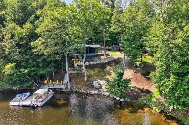 Start enjoying this newly renovated cottage this year! Tucked back in a low-traffic protected bay with long lake views on the west side of Eilean Gowan Island, this cottage is the perfect place to build new memories with family and guests. Enjoy your morning coffee on the primary bedroom deck overlooking your bay. The 2nd bedroom features it’s own deck as well. New kitchen/dining room features quartz countertops, newer stainless steel appliances and picture window with views to the lake. Main bathroom with new fixtures and walk-in shower. New low-maintenance flooring throughout, new interior and exterior light fixtures. New sliding patio doors and windows throughout and stylish window coverings included, new metal roof and resurfaced decks that require little maintenance for many years to come. This Muskoka cottage property sleeps 8 and features the comfort of home with new wall-mounted heat pump exchange heat & a/c units, new baseboard back up heaters, new stackable Washer/Dryer and new wood burning airtight. Be sure to check out the 2 outbuildings which also feature new metal roofs. The bunkie features a mini fridge and coffee corner and patio with views out to the bay. No expense has been spared on the beautifully landscaped terrain with new granite patio for evening fireside enjoyment along with new glass railings on the extensive decking and staircase. The current owners love the large Muskoka room for evening cocktails and sunsets which has 2 new sliding doors. You’ll also love the lower decks close to the water for afternoon fun in the lake. New UV whole home water treatment, 5′ concrete wall crawlspace, updated 200 amp service, submersible pump. The 3rd largest island on Lake Muskoka features extensive 5 km walking trails around the perimeter of the islands’ Nature Reserve at the core. Centrally located for easy access to Bracebridge shopping and multiple marinas. This cottage is ready for you to enjoy your Muskoka experience right away.