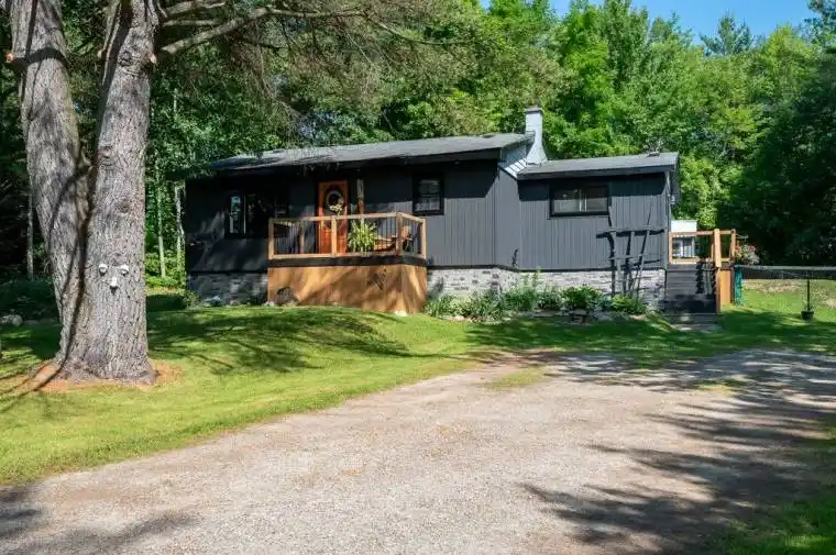 Calling on all young families or empty nesters – your paradise awaits in the country on a partially cleared one acre lot surrounded by a beautiful wooded area. !! Great for commuting : 10 minutes to Coldwater and HWY 400; 30 minutes to Orillia , and 45 minutes to Barrie. This 2 bedroom bungalow has the perfect flow for entertaining with a large dining room overlooking the kitchen and living room. The large main bedroom is ideally situated at the rear corner of the main floor overlooking a wooded area through the large bedroom windows. Updated kitchen countertops, lighting, and backsplash. Updated flooring in Living and dining rooms last year. Exterior vinyl siding ( with new 1″ panel board insulation underneath ) done within last 2 years. The heating bills are kept very reasonable with the use of the relatively new high efficiency propane furnace ( installed 2020 ) and cost effective wood pellet stove in the living room. An updated 100-amp electrical panel was also installed within the last 5 years. Shingles are in good condition. You can go through a rear door off the dining room or through the side entrance door to the large rear deck and above ground pool ( 1 year old liner ) and rear fire pit. There is also a patio area and 2nd firepit at the lower part of the rear yard . A connection fitting from the propane tank to BBQ exists so you will never run out of fuel for the BBQ. A large fenced in area for children or pets exists on the right side of the yard. Plenty of hiking and biking trails with hunting and fishing locations nearby. Be sure to click on the virtual tour button to see the property from the supplied drone footage.