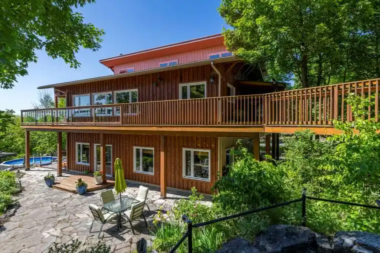 Don’t miss this one of a kind (unique) home built in 2012 (10 inches of insulation in the walls). Windows and natural light on both floors. Ground floor is a walkout entirely above grade. Home was built to let the natural light in with overhangs to protect from the hot sun during the summer and to let the warmth in during the winter (passive solar design). The passive solar design allows the heat to shut off in the winter when the natural light flows in. The views (from inside and out on the upper deck) are simply spectactular in all 4 seasons. Upper loft area gives you extra space. Potential for extra bedrooms with spaces such as loft, office, and den downstairs. Extensive landscaping was created using limestone and perennials….go for a walk in your very own park! 10+ acres with privacy plus and only 5 minutes from town! Large two-level finished shop/showroom with a deck on the second level. The possibilities are endless for this shop/showroom for the new owner. Cool off on hot days in the shade with beautiful summer breezes or a dip in the pool. Really lovely neighborhood and minutes away from Mag’s Landing (the public boat launch) and Marmora’s very own park set out along Crowe River. 35-40 minutes from both Belleville or Peterborough. Marmora and Lake is equal distance between Ottawa and Toronto. Includes a Garden Shed and Large Drive Shed.