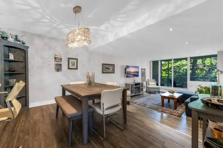 Elegant Oakville Condo 1243 sq.ft, 3 bedroom, 2 bath, corner suite at the very end of the main floor very quiet, yet 5 steps to to the buildings back entrance accessing lush greenery, trees and benches!! Open concept, professionally renovated top to bottom. Mega-master bedroom easily accommodates a king size bed & boasting one full wall of closet space. The open concept great room is impeccable, combining kitchen, dining rm, sunken living rm and spacious private balcony and outstanding entertainment space dining room can accommodate 10-12 guests! Loads of above ground guest parking! The condo is nestled between the banks of Sixteen Mile Creek and Kerr St. An easy 10 minute stroll to Oakville Go Train! 5 minute drive to QEW! Kerr Street with dozens of stores, restaurants, specialty shops. Less than one km to downtown Oakville which offers another dimension of high end coffee shops & fine dining.