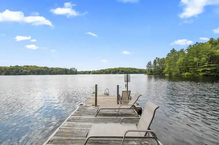 YEAR ROUND COTTAGE/HOME on POPULAR BAY LAKE is tucked away from the Road with 110′ of SOUTHWESTERN exposure to enjoy the summer sun on your dock all day long. 15 – 20 min to Huntsville, on yr round Town maintained Municipal Rd. The lake views are Fantastic here, with deep water entry from the main dock for docking & swimming, with bonus second dock for your canoe & kayaks. 10 min to Novar mini mall, 10 min to Kearney and entrance to Algonquin Park, 5 minutes to doggy park and close to the Sequin Trail & OFSC Trail #95. This truly unique home/cottage blends rustic character & charm with comfort, and envelopes the spirit of the outdoor living with its’; babbling pond surrounded by perennial gardens. Picture yourself enjoying some R&R on the large deck overlooking the lake listening to the pond with birds chirping & singing in the background. Bungaloft floor plan with over 1700 sqft of living space on the main level & upper level. Soaring cathedral ceiling in living room open to dining area with a propane fireplace for those chilly evenings. The main living area includes an eat in modern kitchen with a pantry room with a killer views of the lake! 3 bedrooms, 3 baths including therapeutic tub and 2 pc ensuite bath with walk-out basement & Family & Muskoka room. Carport for parking, large workshop shed with outbuildings for storage. Propane forced air heat, central air conditioning, with Generac generator for full back-up power. Water filtration system is in place for drinking water. Bay Lake is a medium sized lake with DEEP WATER, with depths up to 100′ with three islands & two bays. Public boat launch is 5 minutes away, there is a good mix of full-time residents and seasonal residents for neighbours. The Bay Lake Property Association hosts many events throughout the year to meet and greet. Good cell service here and Rogers internet. The seller is motivated to sell & flexible with a closing date, start making your cottage memories this Fall on Bay Lake!