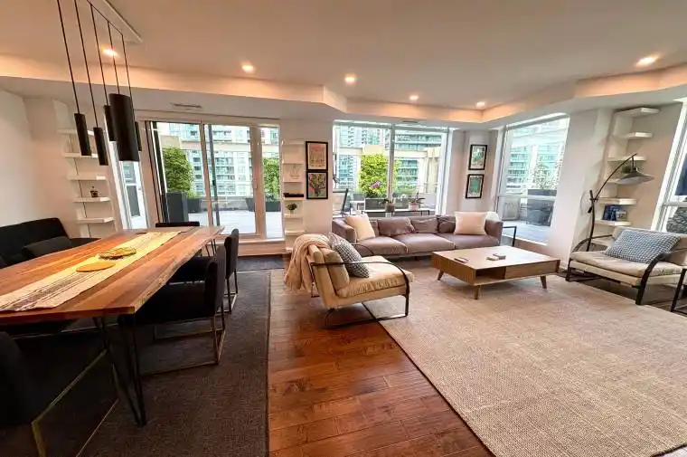Move Into This Exceptionally High-End, Fully-Furnished, ultra clean, Executive Rental With Stunning Views! This Rare 1400+ Sqft Corner Suite boasts a massive private landscaped terrace with waterfront views, perfect for both entertaining and quiet escapes. Inside, the home features two large bedrooms plus den, 2 full bathrooms, a gourmet kitchen with top-of-the-line appliances, sleek modern design, and expansive living spaces tailored for refined comfort. Ideally situated, this residence is just steps from Torontos vibrant Entertainment District, world-class dining, sporting event centres, Billy Bishop Airport, public transportation and the waterfront, placing the very best of the city at your doorstep. Residents also enjoy access to exclusive amenities, including 24 hour concierge, guest suites, a fitness centre, indoor pool, party room and a BBQ terrace with lake views. A rare offering that blends location, luxury, and lifestyle – this condo sets a new standard for upscale city living.
