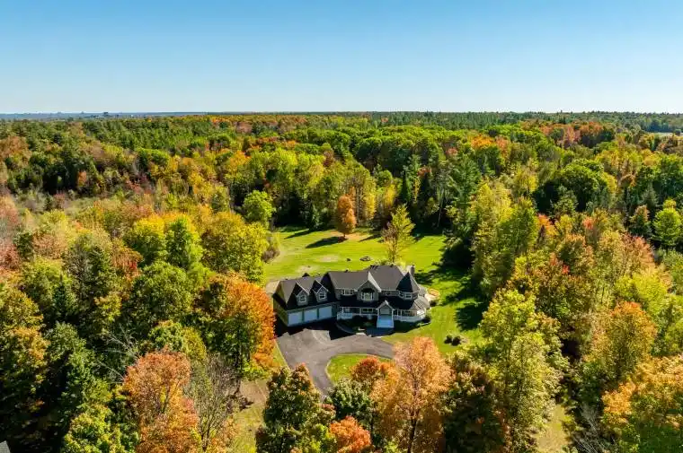 Welcome to an extraordinary retreat in prestigious Marchvale Estates, where over 4,100 sq. ft. of luxury living awaits on more than 3 acres of impeccably landscaped, private grounds. This custom-built residence combines timeless elegance with thoughtful family design, offering 5 bedrooms, 4 bathrooms, and a layout that perfectly balances everyday comfort with grand entertaining. Set back from the road along a picturesque tree-lined circular driveway, the home makes a striking first impression. A 3-car garage, dual front entrances, and dual staircases add both sophistication and multi generational living potential. Inside, natural light pours through abundant bay windows, showcasing sweeping views of the grounds. Three patio walkouts seamlessly connect indoor living spaces to the serene outdoors. The home boasts soaring 9ft ceilings, rich hardwood and ceramic floors, and a chefs kitchen. Formal and casual living areas offer flexibility for gatherings of any size, while a main-floor bedroom or office provides privacy and versatility. Upstairs, the lavish primary suite is a private sanctuary, complete with a spa-inspired 5-piece ensuite. A second private suite with its own ensuite and walk-in closet includes an adjoining bonus room; ideal for a playroom, media room, dressing roon, or teen retreat. Two additional bedrooms complete the family-friendly upper level. The fully finished lower level expands the living space beautifully with new flooring, direct access to the garage, ample storage, a bar and endless possibilities for a home gym, rec room, or guest accommodations. A geothermal system ensures year-round comfort with impressive energy efficiency. Outdoors, an irrigation system ensures lush, low-maintenance grounds, perfect for play and relaxation alike. Ideally located just 5 mins from Kanatas high-tech hub, top schools, golf & everyday amenities. With quick access to Highway 417, this estate offers the ultimate blend of privacy and convenience.