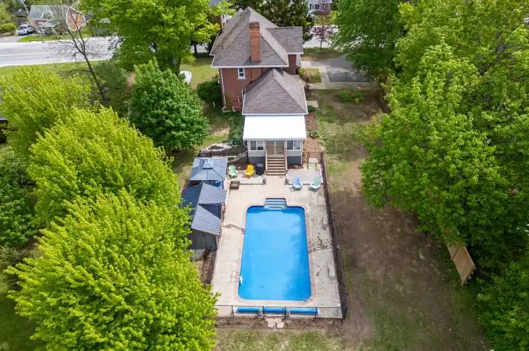 This Victorian estate is a timeless masterpiece. Storied to once be home to a local doctor, this Chatsworth treasure seamlessly blends old-world charm with modern comforts on a private double-wide lot. The stunning double-brick exterior, wraparound veranda, and grand 42-inch solid wood front door make a striking first impression. Inside, intricate woodwork, original hardwood floors, stained glass and transom windows, a Juliet balcony, wide entryways, and soaring ceilings elevate the grandeur. Meticulously preserved, this home showcases the craftsmanship of its era while incorporating thoughtful updates for contemporary living. The formal dining room is perfect for entertaining, while the cozy living room, with its historic fireplace and natural gas insert, invites relaxation. A decorative staircase leads to the second floor, where three spacious bedrooms feature oversized windows and doors. This level also includes a dedicated laundry room and a modern 3-piece bath with an extra-large stand-up shower. The third-floor suite is a private retreat, lined with warm cedar plank walls and insulated with Roxul for year-round comfort. A 2-piece bath completes this tranquil escape. Descending the historic butlers staircase, you arrive in the beautifully updated kitchen. Cherry cabinetry, a centerpiece island, stainless steel appliances, and a striking black slate natural stone floor make this space both functional and stylish. A conveniently located half bath adds to its practicality. Seamlessly connected to two inviting entertaining areas, this kitchen is the heart of the home. On one side, a formal dining area sets the stage for intimate gatherings, while the other opens into a cozy living room with a gas fireplace. Beyond, the four-season sunroom is a showpiece flooded with natural light and offering direct access to the backyard oasis. Completed in 2023, the in-ground pool is a true highlight, surrounded by interlocking stone, a fire pit, and a Mennonite-style pool house.