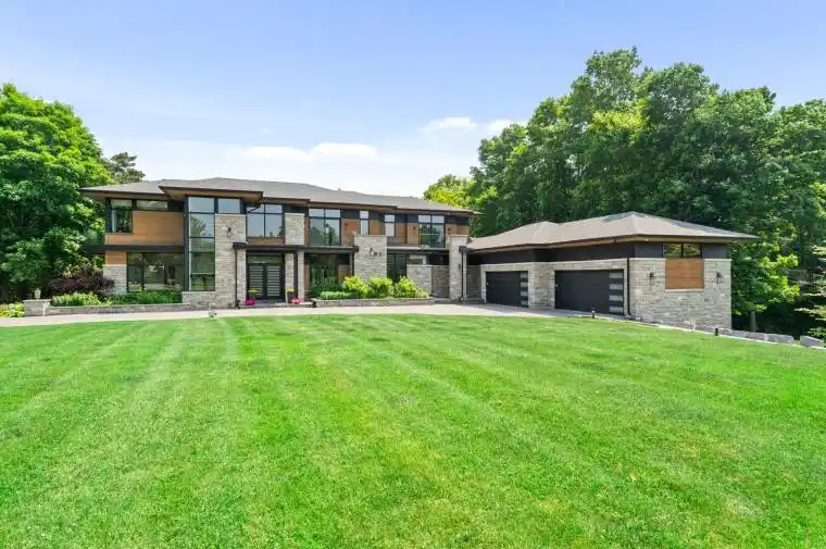 Set on a rare 1.92 acre ravine lot, over 10,000 sq ft custom built estate by David Small Designs blends serene Canadian elegance with bold global influence. Designed for multigenerational living and generational legacy, this modern home offers 7 bedrooms, 9 bathrooms, and an elevator ready shaft to all levels.The main floor features 12′ ceilings, a dramatic 20′ family room with floating staircase and two-sided fireplace, and a chefs kitchen with Gaggenau appliances, slab backsplash, magic corner, and a striking translucent jade marble island. A 12′ NanaWall opens to a covered terrace overlooking the ravine. A formal dining room, tea room with built-in waterfall slab, private guest suite, 2 piece powder, pet wash station, and custom mudroom complete this level. Upstairs, four bedrooms include private ensuites, walk-in closets, and balconies. The primary suite features a steam spa, freestanding tub, floating vanity, boutique dressing room, and ravine-facing balcony. A second floor laundry with cabinetry, sink, and window adds functionality.The finished walkout basement (9′ ceilings) includes a rec room, bar, gym, sauna, 3-piece bath, wine cellar, cold room, art room, games space, music room, and two additional ensuite bedrooms with direct backyard access via a 16′ glass slider. Additional features include a 4 car garage (lift-ready for 6), Lutron lighting, integrated speakers throughout, solid wood floors, Douglas Fir accents, and full city-approved construction. Minutes to private schools, Top-Ranked Schools, Hwy 404, and Angus Glen Golf Club, this is a rare opportunity for discerning buyers seeking privacy, design excellence, and timeless sophistication.