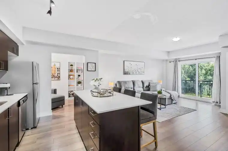 Stylish 1+1 Bedroom Condo in South-East Barries Bistro 6 Community! Looking for the perfect place to call home? This bright and spacious 1+1 bedroom condo offers modern living surrounded by nature backing onto forested trails with peaceful views right from your private, south-facing balcony. Enjoy 850 sq ft of open-concept living, featuring a sleek kitchen with a large centre island, stainless steel appliances – including a gas stove, tiled backsplash, and plenty of prep space ideal for cooking and entertaining. The spacious living area walks out to the balcony with a gas BBQ hookup, perfect for summer nights. Need a home office or guest space? The cozy den offers flexibility as a work-from-home setup, reading nook, or second bedroom. The large primary bedroom includes great closet space, and the modern 3-piece bath features a glass walk-in shower and oversized vanity. Extras include full-size ensuite laundry, a welcoming tiled foyer with double closet, and access to incredible amenities gym, basketball court, park, community kitchens, and more. Located just minutes to Park Place, Costco, Barries waterfront, and with easy access to Yonge St & Hwy 400 this is the ideal spot for comfort and convenience! Included in lease: Internet/Cable, Water, Building Insurance, Common Elements, & 1 Parking Space. Tenant To Pay Hydro, Gas, & HWT Rental. Looking For A+ Tenants, No Smoking, No Pets. Rental App, Letter Of Employment, Credit Report, Recent Pay Stubs, & References Must Be Provided With Any Offer To Lease.