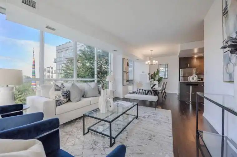 *Don Mills Station At Your Doorstep* Welcome to an exquisite luxury condo, nestled in the prestigious Emerald City Community. This stylish residence offers more than 1000 square feet of living space, and blends modern sophistication with timeless charm, creating a truly elevated living experience. Upon entry, you’re welcomed into a freshly painted interior featuring a sun-filled open-concept living and dining area with gleaming floors, soaring 9 foot ceilings, elegant light fixtures, and floor to ceiling windows. The chef-inspired kitchen is equipped with premium stainless steel appliances, granite countertops, a custom backsplash, generous cabinetry, and a convenient centre island. The expansive primary bedroom offers a walk in closet and a four piece ensuite. Enjoy a spacious 177 square foot balcony overlooking the serene courtyard and plush greenery, plus the convenience of one parking space and one locker. At Emerald City, residents benefit from an array of upscale amenities including a cutting-edge fitness center, swimming pool, hot tub, party room, games room, and 24-hour concierge service. Move right in and start enjoying the lifestyle you deserve! The home is conveniently located next to shops, dining, great schools, highways 401 and 404/DVP, and public transportation including Don Mills Subway Station at your doorstep, providing the ultimate in urban living.