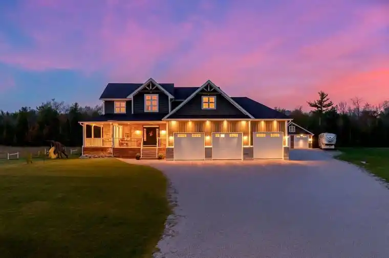 Welcome to 2448 Stockdale Road, Severn Township. Set on 4 acres, this luxurious custom-built home with wrap-around porch showcases exceptional craftsmanship and high-end finishes throughout. The main level is open, bright, and designed for modern living, featuring a stunning custom kitchen with an oversized island, quartz countertops, a 48 dual-fuel range, and a spacious family room with a stone gas fireplace. Additional main floor highlights include a private office, mudroom, elegant 2-piece bath, 9-foot ceilings, and engineered hardwood flooring throughout. The second level offers 5 generous bedrooms, including a serene primary retreat with coffered ceilings, a luxurious 5-piece ensuite with a soaker tub, dual walk-in closets, and a private sitting room. This level also features a 5-piece main bath, an additional 4-piece bath, and rich engineered hardwood flooring throughout. The finished lower level features a large, open recreation room, office, laundry area, and a 3-piece bath, all with oversized windows that bring in natural light. For the hobbyist, the triple-insulated and heated attached garage provides ample workspace, complemented by a detached heated and insulated double garage with a loft for additional storage. Notable upgrades include soffit lighting, heated tile floors, wainscoting, shiplap, coffered ceiling details, and premium trim finishes. Located just 10 minutes from Orillia or Washago, with nearby access to Lake Couchiching and the Trent-Severn Waterway, Highway 11, and endless recreation opportunities for boating, snowmobiling, and ATV adventures. An exceptional property where luxury meets country living, every detail thoughtfully designed and beautifully executed.