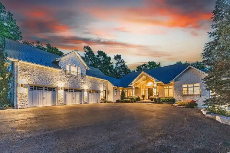 8,000 + SQ FT ESTATE ON 1.33 ACRES WITH RESORT STYLE BACKYARD, POOL, HOT TUB, TRIPLE CAR GARAGE & ADDITIONAL LIVING QUARTERS! Situated in one of Oro-Medonte’s most prestigious enclaves, this bungalow offers over 8,000 sq ft on 1.33 acres of landscaped grounds with a stately stone exterior. A long driveway provides parking for 16, complemented by a heated 3-car garage with a lift for 4 car capacity and an EV charger. Soaring ceilings, refined craftsmanship and designer finishes define the home. The chef’s kitchen impresses with solid wood cabinetry, a massive island, premium appliances, including a $24k Thermador range, while a breakfast nook captures serene forest views. A dining room with a custom-built-in cabinet is perfect for entertaining, and the living room features a stone fireplace and walkout. The primary offers 2 walk-in closets, a walkout to the pool and an ensuite with heated floors, soaker tub, and glass-walled shower. 2 additional bedrooms share a 4-piece bath, with a powder room, laundry and mudroom completing the level. The walkout basement boasts 3 additional bedrooms, including one with a semi-ensuite 4-piece bath, a 2-piece bath, a spacious den/craft room, and a rec room featuring a double-sided fireplace, wet bar, pool table, and games area, and a walkout to the backyard. Above the garage, a private living area with a separate entrance includes a kitchen, living and dining space, bedroom, laundry hookups, and independent heating/cooling. The backyard presents an inground saltwater pool with a waterfall, hot tub, pool house, gazebo, patio, and an 8-zone irrigation system. Upgrades include an aluminum roof (2018), 2 furnaces and 2 A/C units (2022), a generator (2022), Phantom Screens, powered window coverings, a Sonos sound system, wired security, high-end lighting, a striking glass and hardwood staircase and a 9′ x 14′ sliding glass wall. Minutes to golf, skiing and Lake Simcoe, less than 15 minutes to Barrie and approx. 1 hour to Pearson Airport.