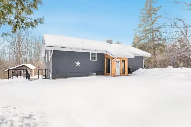 Top 5 Reasons You Will Love This Home: 1) Tranquil and private 48-acre estate surrounded by nature, featuring scenic walking trails, a chicken coop, dog kennel, barrel sauna, hot tub, gazebo, and lush vegetable and perennial gardens, your own country sanctuary 2) Thoughtfully designed with two fully self-contained living spaces, offering the ideal setup for multi-generational living or guest accommodations 3) Move-in ready with stylish updates throughout, including a newer roof, modern water system, upgraded appliances, and quality finishes that blend comfort with functionality 4) Impressive 1,200 square foot outbuilding with 600-amp service, perfect for a home-based business, workshop, creative studio, or expansive storage, complemented by a newly installed 65’x30’x15′ covered storage dome providing additional space for equipment, vehicles, or projects 5) Ideally located just minutes to Highway 400 and Moonstone ski hills, and only 30 minutes to Barrie, Orillia, or Midland, presenting the perfect balance of seclusion and accessibility. 1,564 above grade sq.ft. plus a finished basement.