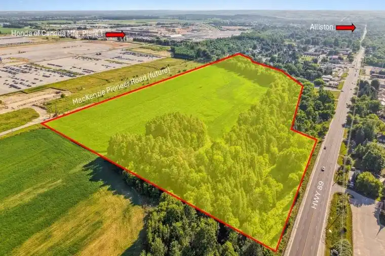 Royal LePage Commercial is excited to bring to market a rare opportunity to purchase approximately 28 acres of raw land directly adjacent to Honda Manufacturing Plant 1 in Alliston, Ontario. A unique site that includes EA2 zoning for industrial and commercial uses, fronting on both Highway 89 and future extension of MacKenzie Pioneer Road to the south. One of the few remaining EA2 zoned sites in the Industrial Parkway corridor with close proximity to other manufacturing businesses and established commercial and retail developments to the east like Walmart Supercentre. Approximately 16.75 acres is zoned EA2 (Employment Area Two Zone) permitting uses like auto, data processing, industrial, office, R&D and others with max height of 37m. Approximately 11.25 acres zoned EP (Environmental Protection Zone) which includes a beautiful tributary connecting to the Boyne River. The asking price works out to $389,000 per acres.