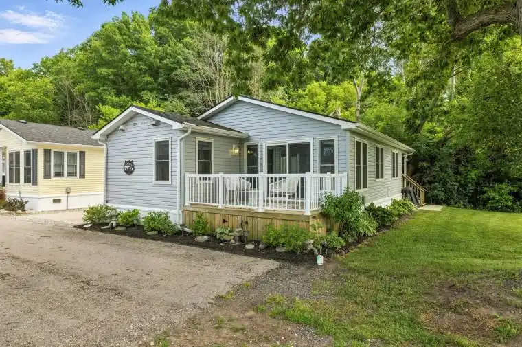 Live the resort lifestyle year-round in Unit #1 at Oriole Park Resort–a rare gem in Komoka just 10 minutes west of London. This vibrant four-season retirement community offers a peaceful, cottage-like setting and this 3-bedroom, 2-bathroom modular home is packed with features that make everyday living feel like a getaway. Inside, enjoy hand-scraped laminate floors, an open-concept living, dining, and kitchen area filled with natural light, plus generous closet space at the entrance. The kitchen features stainless steel appliances, tile backsplash, and ample cabinetry. Off the dining area, step onto a private back deck with patio space and a nearby propane hook-up–perfect for summer BBQs.The main 4-piece bathroom is equipped with built-in storage and a convenient stacked washer/dryer. All bedrooms are bright and spacious, with great closet space. One room functions beautifully as a sunroom, an office or third bedroom–your choice! From there, sliding doors lead to a cozy enclosed deck for even more outdoor enjoyment. The primary suite features vaulted ceilings, generous closet space, and 3-piece ensuite. Enjoy unobstructed outdoor views with a neighbouring lot that will remain vacant–offering extra privacy and serenity. A storage shed adds practical outdoor space for tools and gear and two parking spaces is a bonus! But what truly sets this home apart is the unmatched lifestyle Oriole Park offers: clubhouse amenities like a salon and spa, golf simulator, dog grooming station, fitness centre, pickleball court, event space, library, and a fully licensed bistro/bar with a pool table and darts. Stroll the beautifully landscaped grounds, complete with koi ponds, shuffleboard, an off-leash dog park, saltwater pool, community fire pit and garden, and BBQ areas.If you’re ready to downsize without compromise, Unit #1 is your ticket to affordable, stylish, and social living in one of the regions most unique communities.