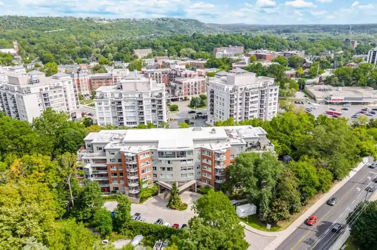 Creekside Living in the Heart of Dundas! Welcome to this highly sought-after 2-bedroom, 2-bath condo, perfectly positioned on the Creekside of the building with serene views of green space, Spencer Creek, and its beautiful rapids. Set in one of Dundas’s most desirable locations, this home offers the ideal balance of natural beauty, small-town charm, and modern convenience. Just a short walk from historic Downtown Dundas, you’ll find boutique shops, cozy cafés, restaurants, and specialty stores plus groceries and everyday essentials only steps away, making it perfect for those who prefer not to drive. Outdoor enthusiasts will love the nearby picturesque walking trails, conservation lands, and easy access to scenic outdoor spaces, while commuters benefit from proximity to major routes. Inside, the home features hardwood floors, a modern kitchen with stainless steel appliances and quartz countertops, and a spacious primary bedroom with double closets and a private 4- piece ensuite. The large second bedroom offers flexibility as a guest room, home office, or den, while a second full bath and in-suite laundry add comfort and convenience. The building is thoughtfully designed and rich in amenities, including a guest suite, fitness room, sauna, and a party/ games room complete with a full kitchen, terrace, and BBQ area perfect for entertaining friends and family. Built in2000 to LEED standards and part of a CMHC energy and water efficiency research initiative, this architecturally innovative building offers superior insulation, a draft eliminating design, and heat recovery ventilation for enhanced air quality, making it one of Canadas most efficient condo buildings. This gem is waiting for you!