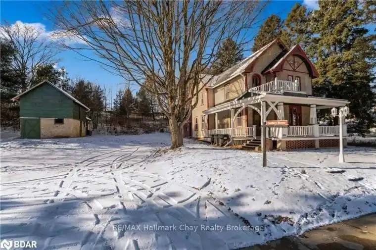 Welcome to the Davenport House. This beautiful century custom builders home will call you with it’s unique custom finishes. The wrap around covered porch, original craftsman front door with stained glass. Custom wood work staircase, balusters and under staircase storage wood panels. Crown molding, 9 inch baseboards and wood detail custom ceiling. Classic century style with 2 separate stair cases. Kitchen offers the original Tin ceiling a walkout to side deck and a back 3 season den and enclosed storage room and back staircase to the upper level. Pantry/laundry room off kitchen. Separate dining room and living room. Main floor generous sized bathroom in addition to the upstairs full bathroom. Upper sunroom with walkout to the balcony. This home offers 3 upper bedrooms. This is an extremely well maintained century home. Updated gas hot water tank, updated copper electrical 200 amp breaker panel. Updated plumbing, basement walls have spray foam insulation and new septic. All exterior walls have been insulated. Most windows are updated, roof in in good condition. Heating cost is very efficient with the concrete exterior walls and added insulation. Outdoor structure a detached smaller barn and garden shed. Close hwy access 15 min from Barrie. Located across the road from a park. Close to skiing, golf, hiking and snowmobiling.