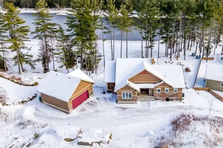 Discover a rare riverfront estate set along the tranquil shores of the Ottawa River. This custom-built 2019 bungalow offers 4 bedrooms, 3 bathrooms, and over an acre of beautifully landscaped grounds, framed by mature pines for exceptional privacy. Thoughtfully designed to balance elegance and comfort, the home seamlessly connects refined interiors with breathtaking natural surroundings. Inside, soaring vaulted ceilings and expansive windows capture panoramic river views and flood the open-concept living space with natural light. The chef’s kitchen is both stylish and functional, featuring high-end appliances, a large island, a walk-in pantry, and a reverse osmosis system-ideal for daily living and effortless entertaining. The primary suite is a private retreat with serene water views, balcony access, and a spa-inspired ensuite complete with a glass shower, deep soaker tub, and dual vanities. A second bedroom on the main floor adds flexibility, while the walkout lower level offers radiant floor heating, two additional bedrooms, a custom recreation area, and direct access to the backyard. Every detail has been carefully considered, from the well-appointed laundry room with granite counters and custom cabinetry to modern conveniences including motorized blinds, programmable thermostats, central air, Lifebreath air exchanger, and a full HD security system. An oversized detached heated garage provides ample space for vehicles, storage, or a workshop. Outdoors, the property becomes a true oasis. Enjoy year-round relaxation in the screened spa lounge with hot tub, gather around the fieldstone firepit, or head to the floating dock for boating, kayaking, and exceptional fishing, an angler’s paradise. Additional features include an irrigation system, cedar kayak rack, and a charming hobby garage. This is more than a home; it is a refined waterfront lifestyle offering privacy, comfort, and timeless natural beauty.