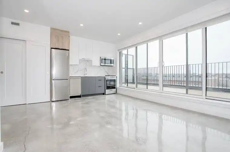 Beautiful 2 bedroom 2 bathroom unit in modern multiplex at Queen and River! This upscale residence features polished concrete floors throughout, overflowing natural light, a split bedroom floor plan, and large kitchen perfect for entertaining. Boutique building with keyless entry, EV charging, event room and rooftop patio with CN Tower views. Eco-friendly building with geothermal heating and cooling. Bell Wifi included. Steps to TTC, Distillery District, Riverside and walking trails.