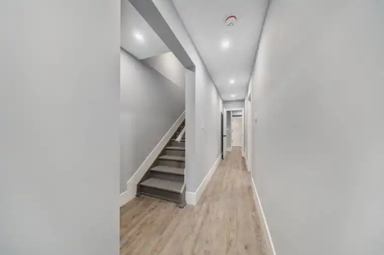 Rarely Offered Brand New Detached Legal Triplex Unit 3- This bright basement-level unit boasts 8 ft ceilings, 2 bedrooms each with their own ensuite bathrooms, and a spacious open-concept living/dining area. The modern kitchen features quartz countertops, stainless steel appliances, and abundant natural light, with direct walk-up access to the backyard. Enjoy additional features including in-suite laundry, engineered hardwood flooring, and pot lights throughout. Ideally located within steps to public transit, schools, and everyday amenities.