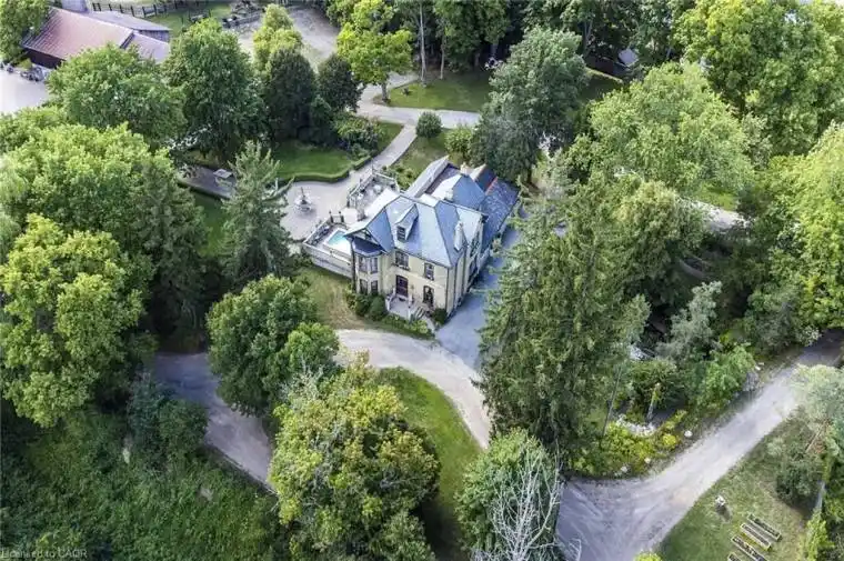 Set on a rare 33-acre riverfront estate backing onto the Nith River, this exceptional property offers the opportunity to own a truly stately home in an unparalleled natural setting. With access to river views, mature landscaping and scenic trails, the property delivers privacy, beauty, and scale – all close to the 401 and the charming community of Ayr. The elegant 1880 century residence is rich in character and craftsmanship, showcasing original features. This 4 bedroom 3 bathroom home exudes timeless charm while offering the presence and setting expected of a distinguished country estate. Unique living spaces throughout this home including a separate dining room. Outdoor living spaces further enhance the lifestyle, featuring a terrace with plunge pool, along with a stone amphitheatre overlooking the river. In addition to its appeal as a private residence, the property has formerly operated as an event venue and remains zoned for that use, offering valuable flexibility for future owners. Supporting structures and infrastructure reflect its prior use, creating opportunities for a variety of permitted applications. With its expansive acreage, prime river frontage, and existing zoning, the property also presents potential for future development, subject to municipal approvals. Whether envisioned as a grand private estate, a continuation of permitted commercial use, or a longer-term investment opportunity, this is a truly rare offering. An exceptional property where estate living, versatility, and future potential come together.