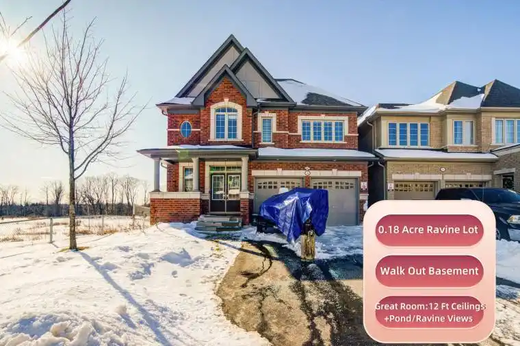 Absolutely Stunning Luxury Home Backing Onto Ravine & Pond in Prestigious Windfields! **0.18 Acre Ravine Lot W/212 ft(south side)depth, nearly 3,000 sq ft plus an Walk-out Basement, 4+1 Bedroom 1 Office 5 Washrooms. Situated on one of the best and deepest premium lots in the community, truly a rare gem. An extended driveway provides striking curb appeal. The upgraded interior showcases main floor 9 ft smooth ceilings, rich hardwood flooring, and pot lights throughout. A spacious office/library overlooks ravine and pond views like living art, ideal for working from home. The Magnificent Great Room features 12 ft soaring ceilings, oversized windows, and a luxury chandelier, offering breathtaking panoramic pond and ravine views. The inviting family room includes a cozy gas fireplace overlooking the serene ravine.The chef-inspired kitchen is appointed with quartz countertops, high-end stainless steel appliances, and an extended breakfast bar. The sun-filled breakfast area walks out to an oversized deck, backing onto a peaceful woodlot for ultimate privacy.Upstairs, a luxurious primary retreat with two walk-in closets, a spa-like 5-piece ensuite, and a tranquil sitting area with ravine views. A second oversized primary bedroom offers a private 4-piece ensuite.The rest of 2 bedrooms feature semi ensuite access. 2nd-floor laundry adds everyday convenience.The walk-out basement provides a 5th bedroom with a 3-piece ensuite and endless customization potential. The extra-deep backyard oasis with gazebo is perfect for year-round enjoyment, surrounded by lush woods and a tranquil pond.Located in one of Oshawa’s most prestigious communities, minutes to Ontario Tech University, Durham College, scenic golf courses, and all essential amenities.A truly one-of-a-kind sanctuary: a 212-ft deep ravine lot, privacy, walk-out basement, and panoramic pond views.