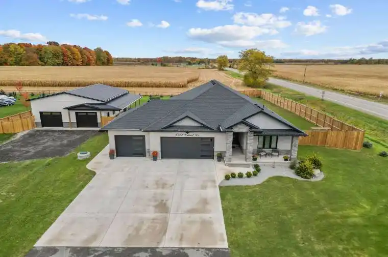 Set on an almost three-quarter acre lot just minutes from Strathroy, this remarkable property showcases a brand new 30×40 ft heated and air-conditioned shop with 13-foot ceilings, a large covered patio, matching house siding, and a steel roof designed for lasting durability. Built beside the home to connect seamlessly with the massive concrete patio, it creates a functional outdoor living space perfect for entertaining, relaxing, or watching sunsets over the open fields that provide full privacy through the summer and fall. The property is fully fenced with privacy trees already planted, features a gas line for the barbecue, and offers both a covered front and back porch for year-round enjoyment. Inside, the home combines craftsmanship and comfort with 10-foot ceilings in the entry, a vaulted living room anchored by a stone gas fireplace, and engineered hardwood throughout. The kitchen includes a quartz backsplash, pot filler, extra large island, and wine fridge, while transom windows, 9-foot bedroom ceilings, and a tray ceiling in the primary suite add architectural character. The primary wing features a luxurious ensuite with a soaker tub and a spacious walk-in closet, privately tucked away from the main living areas. The oversized three-car heated garage is equipped with a gas heater, and the basement offers exceptional versatility with two large bedrooms, a full bath, rough-in for a bar or second kitchen, and a conduit for a projector. Additional details include a generator hook-up, exterior security camera system, soffit outlets for Christmas lights, and a large mudroom with custom built-ins, quartz bench top, and kick-close drawers. The home runs on natural gas and well water with a reverse osmosis system, and Bell Fibe Internet and TV provide modern connectivity. Located on a country road with a dead-end street nearby for walking and biking, this home is only five minutes to Strathroy and thirty minutes to London.