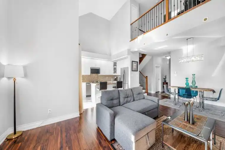 Offer Anytime Show with Confidence! A fantastic opportunity for first-time buyers, downsizers, or young professionals! This freshly painted and sun-filled 2-bedroom + den, 2-bath townhouse features soaring 20-ft ceilings in the Great Room, a stylish media loft, and a versatile upper-level den, perfect as a cozy retreat by night and a productive home office by day. Enjoy in-home laundry, extra storage, and a private garage parking spot. Located just minutes from Hwy 401, the 407 extension, GO & Durham Transit, it’s perfect for commuters. Walk to Lifetime Fitness, Costco, Home Depot, parks, schools, shopping, dining, and more. A stylish, low-maintenance home in a prime, convenient location with a lot to offer!