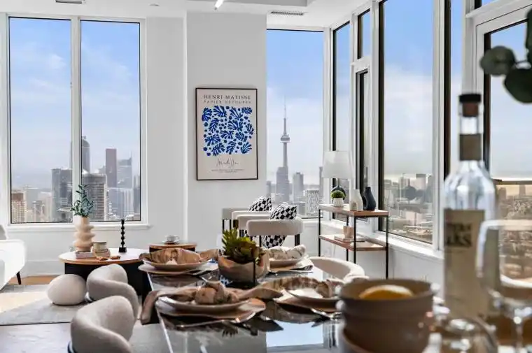 When Yorkville prestige meets true designer living-Suite 6209 offers nearly 1,000 sqft of refined interior space W/a rare 3+1 bdrm layout &10-ft ceilings, wrapped in floor-to-ceiling glass that elevate every moment. This Sunfilled/Airy unit delivers an unobstructed panoramic sweep across north, south &west exposures-capturing iconic CN Tower, lake, greenery&city skyline views. At the heart of the home is a showpiece chef’s kitchen featuring Miele 30″ integrated appliances, a dedicated wine cellar, and a dramatic marble waterfall island W/extended dine-in seating for six-perfect for entertaining. Premium stone continues throughout W/marble countertops, range surround& full-height backsplash. The spa-inspired bathrooms are finished to the highest standard W/one-piece marble sinks, heated floors& stone-clad feature walls surrounding a sculptural tub. Double door to the gallery-aliked balcony from living and bedroom- have your fresh breeze with the 300 degree view. Thoughtful upgrades include herringbone flooring throughout, custom Cecconi Simone tinted/illuminated cabinetry& sleek layered lighting W/pot lights & custom closet organizers. A generous primary retreat features a double closet for effortless storage. A statement residence in the heart of Yorkville-luxury, light &views without compromise. Parking included. Residents enjoy an impressive collection of amenities, including a 24-hour concierge, an elegant lobby, visitor parking, an indoor/outdoor infinity pool, a tranquil rooftop Zen garden W/ BBQs,a fully equipped gym W/spas, kid’s playrm, an intimate piano lounge, a dramatic party rm& the building’s signature Bordeaux lounge, Zen reflection rm, theatre rm,wifi-social lounge &business centre. Perfectly situated across from the Four Seasons Hotel, the address is surrounded by the world’s most prestigious brands boutique store &acclaimed Michelin-star restaurants. The ROM, top galleries, TTC subway stations, the University of Toronto all at your door steps.