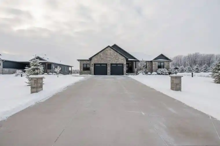 Some homes check a few boxes, this one checks them all. With over 4,000 sq ft of finished living space across the main floor and lower level, this custom-built bungalow offers a level of space and flexibility rarely found. Ideal for families who want room to live, work, entertain, and grow. Set in Allenford’s sought-after Nickason Drive subdivision, it blends a peaceful country feel with unbeatable central convenience. Just 15 mins to Southampton, 20 to Owen Sound & Port Elgin, 40 to Bruce Power. Curb appeal stands out with full Shouldice stone exterior, stamped concrete porch, triple-wide driveway, modern entry and oversized 2.5-car garage. Inside, the open-concept layout is refined and functional. The kitchen is a showpiece with quartz counters, contrasting white and white oak cabinetry, brick-style backsplash, black stainless appliances and farmhouse sink overlooking the yard. A walk-in butler’s pantry adds bonus storage and prep space, with a stylish 2-pc bath tucked nearby. The living room features a propane fireplace with stone surround, custom built-ins and glass doors to the backyard. The primary suite offers a spa style ensuite and walk-in closet with laundry nearby. Two additional bedrooms share a beautifully finished 4-pc bath. The fully finished lower level impresses with 9-ft ceilings, in-floor heat, custom media wall and space for a golf simulator, gym or play zone, plus a 4th bedroom, office/guest room and designer 3-pc bath. Outside, relax on the covered 16′ x 8′ patio or soak in the hot tub under the gazebo. The fenced yard backs on to open space for privacy and peaceful views. A rare, best-of-the-best offering – homes like this don’t come along often.