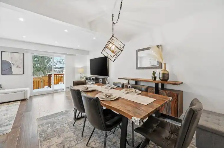 Beautifully maintained corner-unit, carpet-free, 2-storey condo townhouse in Burlington’s sought-after Brant Hills neighbourhood. Offering 3 spacious bedrooms and 2 bathrooms, this home stands out with its extra natural light, added privacy, and open, airy feel-benefits only a corner unit can provide. The main floor was fully renovated in 2025 and features hardwood flooring, a warm and functional layout, and a well-designed kitchen with ample cabinetry, stainless steel appliances, and a large pantry, making everyday living both comfortable and convenient. The bright living and dining area opens to an extended private back deck (2025) surrounded by mature trees. Upstairs, you’ll find generously sized bedrooms, including a primary with his-and-her closets. The fully finished basement (2024) is ideal for a rec room, home gym, or play area. Additional highlights include energy-efficient windows (2023), an attached garage with extra driveway parking, modern finishes throughout, and a solid, well-built feel that owners truly appreciate. Enjoy a well-managed complex with access to a private outdoor pool, visitor parking, snow removal, and landscaping. Ideally located in a quiet, family-friendly neighbourhood, within walking distance to Fortinos, Food Basics, Dollarama, LCBO, the Beer Store, banks, excellent schools, and beautiful parks, with quick access to Highways 403 and 407, and just minutes to Costco, Home Depot, and Burlington Mall, this home perfectly balances lifestyle, convenience, and long-term value.
