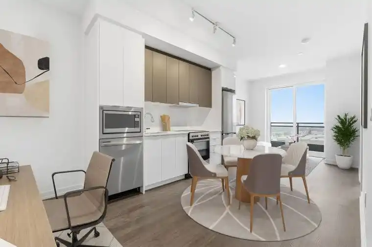 Enjoy A Functional 1-Bedroom + Den Layout At Joy Station Condos With Modern, Designer Finishes. The Primary Bedroom Features A Private Ensuite Bathroom And A Spacious Walk-In Closet, Providing A Secluded Retreat, While The Versatile Den Serves As An Ideal Home Office Or Secondary Guest Space Conveniently Located Across From A Full Second Bathroom. The Open-Concept Living And Kitchen Area Flows Seamlessly Onto A Spacious Balcony, Creating An Airy Atmosphere Perfect For Entertaining. Complete With In-Suite Laundry And A Distinct Foyer Entrance, This Home Combines Functional Luxury With The Premium Finishes. Great Walkability From This Location: Mount Joy GO Station, Grocery Stores & Multiple Retail Plazas All Steps Away. Building Amenities Include Rooftop Terrace With BBQ Stations, Gym, Party/Dining Room, 24-Hour Concierge, Business Centre With WIFI And Games Room. Rental Comes With One-Year Free Internet!