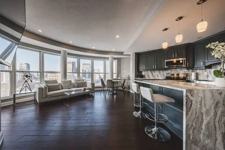 Welcome to one of Hamilton’s most iconic residences, the illustrious Chateau Royale where everyday is elevated. Inside, you will find an exceptional unit anchored by a dramatic, floor-to-ceiling semi-circular window. An architectural statement that frames the skyline like a custom curated work of art. By day, natural light pours in and wraps the room in warmth. By night, the city becomes a living canvas, suspended just beyond the glass. Engineered hardwood flooring throughout delivers a warm, sophisticated foundation for this spaces modern design. The kitchen is finished with premium Italian granite countertops that wrap seamlessly around sleek, modern cabinetry, creating a refined, cohesive design that balances warmth with contemporary elegance. Walking distance to the Hamilton GO, hospitals, schools, bus routes, and the trendiest restaurants Hamilton has to offer. A combination of view, square footage, and location that is rarely offered at this price point.