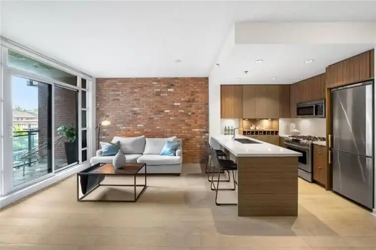 Set in the heart of Leslieville, Showcase Lofts puts you right where you want to be-steps to Queen Street East, local coffee spots, indie shops, neighbourhood favourites, and easy TTC access. Whether you’re heading downtown or out of the city, the DVP and Gardiner are close at hand.This one-bedroom condo offers 635 sq. ft. of smart, well-finished living space with a 40 sq. ft. balcony. The open layout features a reclaimed-brick accent wall, floor-to-ceiling windows, high ceilings, wide-plank hardwood floors, and a balcony overlooking the courtyard-perfect for a quiet coffee or evening wind-down.The kitchen blends style and function with woodgrain cabinetry, under-cabinet lighting, quartz countertops, built-in wine storage, an island with seating, pot lights, and stainless steel appliances. In-suite laundry with a stacked washer and dryer keeps things easy.The bedroom is spacious, with a walk-in closet and its own walkout to the balcony. The four-piece bathroom is clean and modern, finished with quartz counters and a deep soaker tub with shower.One parking space and one locker are included for ultimate convenience. Residents also have access to concierge service, a fully equipped gym, media and party rooms, guest suites, and a ground-level patio.