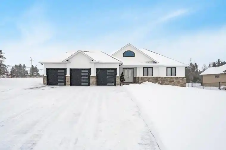 Top 5 Reasons You Will Love This Home: 1) Set on a 0.75-acre lot, this stunning custom-built home offers breathtaking sunrise views from the backyard and unforgettable sunsets from the front, all within a 15 minute walk to Bass Lake, the striking white Board & Batten ranch style bungalow with sleek black accents creates an impressive first impression, with an oversized three-car garage, featuring extra depth in the centre, perfect for a truck or van 2) The twice-paved driveway (2024) provides ample, secure parking for RVs, boats, and multiple vehicles, with the eye-catching Jewel Stone interlock walkway leading to the front entrance, while the rear of the home features a poured concrete covered porch, complete with a gas barbeque hookup and perched atop a scenic hill, framing panoramic countryside views 3) Instantly feel at home in the grand, light-filled entryway showcasing soft white and grey porcelain tile, leading to a stunning wall of windows and doors overlooking the expansive backyard, along with a kitchen featuring an impressive quartz island, vaulted ceilings, a beautiful gas fireplace, and black-trimmed doors topped with transom windows flooding the space with natural light 4) Designed for modern comfort and convenience, the home is equipped with stainless-steel appliances, including a new stainless-steel stove, an owned humidifier, water softener, full water filtration system, and upgraded wood flooring on the main level, with a well-designed laundry room providing direct access to the garage 5) Appreciate the full basement thoughtfully prepared with an installed subfloor, insulated exterior walls, and high-grade vinyl flooring (approximately $1,900), ready for two bedrooms and a bathroom; located just six minutes from Orillia and essential amenities, with a gas station and shops nearby, and access to skiing, biking, and water sports. 1,929 above grade sq.ft. plus an unfinished basement.