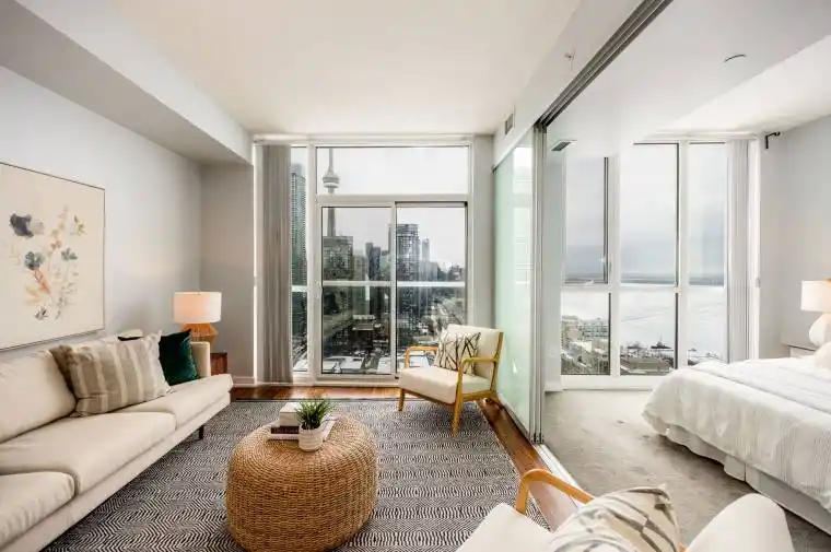 Spectacular South East-facing, unobstructed views of the park, water, and city skyline from this light-filled and airy 1+1 bedroom condo with parking. Do not miss these gorgeous lake views. The spacious open-concept layout offers excellent flow for everyday living and entertaining. The primary living spaces have soaring 8’11” ceilings! The generous primary bedroom overlooks the park and lake, while a versatile den provides ideal space for a home office or guest area. The modern kitchen features stainless steel appliances, quartz countertops, and space for an eat-in area, opening to a well-sized living room with a Juliet balcony. A welcoming foyer with a large closet adds practical storage. Perfectly situated close to the TTC, Harbourfront, Rogers Center, Gardiner Expressway, Billy Bishop airport, Toronto Waterfront, parks, shops, restaurants, and bars with unbeatable convenience. Incredible amenities including a 24 hour concierge, visitors parking, games and theatre room, Party room with kitchen, guest suites, full size gym, fitness, weight, and cardio, yoga studio, indoor pool with a sauna, outdoor terrace, pet spa.